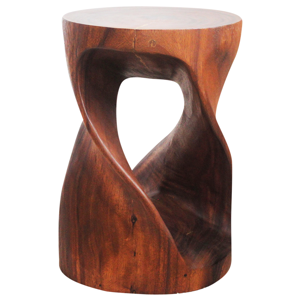 The Round version of the Original Twist Stool Design. Hand-carved and completely eco-friendly is this Round Twist Stool. The beauty of this design lies in its simplicity. It’s bold, yet gentle, rustic yet refined. One quarter twists support this elegant piece, which can serve as an end table, display stand, or stool for last minute seating. At 14 inches in Diameter x 20 inches High and finished in Natural rich Walnut tone Oil. Hand rubbed in natural nontoxic Walnut tone oil that is polished to a matte finish. Color ranges from medium to dark Walnut brown tones that will darken as the wood ages