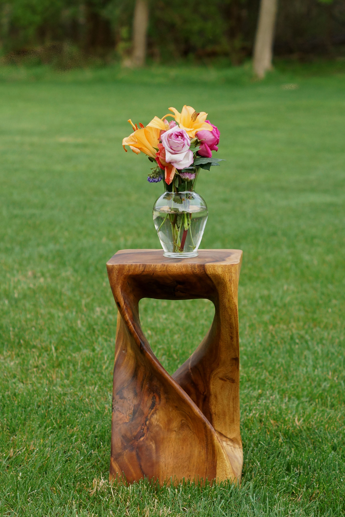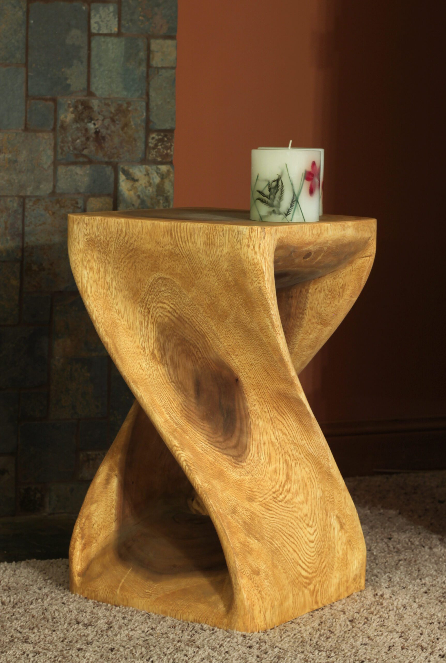 Our classic twist end table brings rustic style and an architectural look next to your sofa or bedside. It showcases a curving square body that’s ideal for holding a small table lamp or displaying your favorite framed photos. The frame is crafted from solid acacia wood with wood scoring and a rustic walnut oil finish for a light sheen from every angle. This table has a weatherproof design, so it works well outside on the porch or patio. Plus, this table measures 20″ tall which makes it ideal for smaller spaces. No assembly is required.