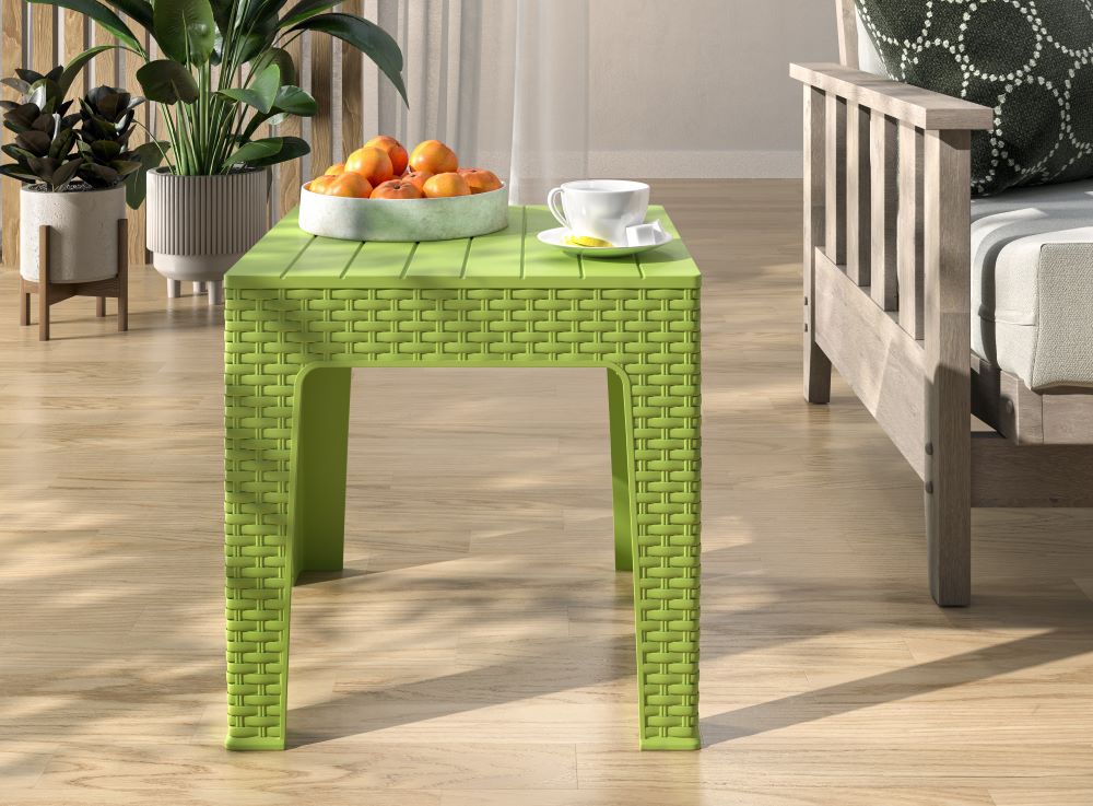 Featuring a woven plastic material with rattan finish, this square table is durable and elegant in style.
